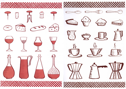 Här är skisserna till två kökshanddukar på tema vin och kaffe som Ekelunds linneväveri tillverkade. Men det är några år sedan. De hette följdaktligen ”Wine” och ”Coffee”.