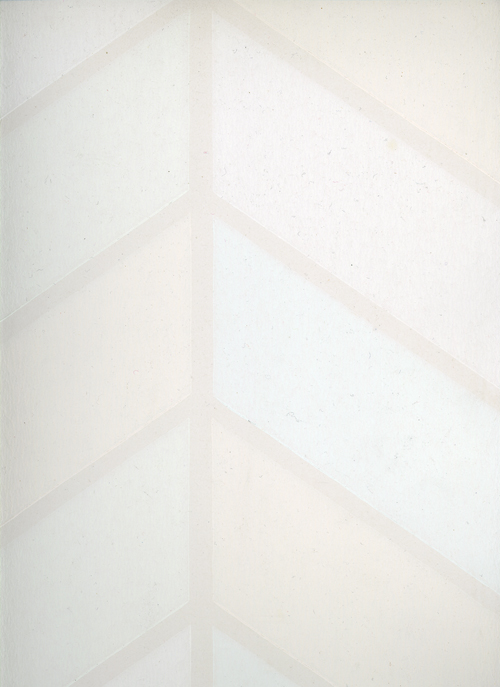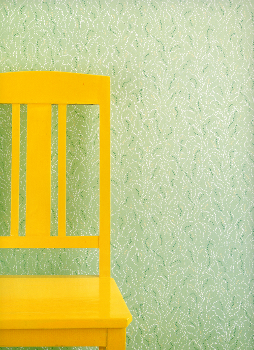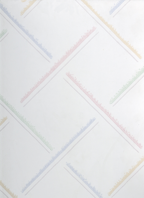 Tapetmönster Mirjam för Duro 1985, med en liten ”luddig” effekt som jag använde mig av på ett par mönster på den tiden, bl.a. ett mönster för IKEA jag visat tidigare. Sen mönstret Delta också från 1985, ett slags fiskbensmönster som bara innehöll olika fält av brutet vitt. Lite svårt att återge här. Sen ytmönstret Svingel som fanns i typiska 80-talspasteller, en rosa, en blå och som här en grön färgställning.