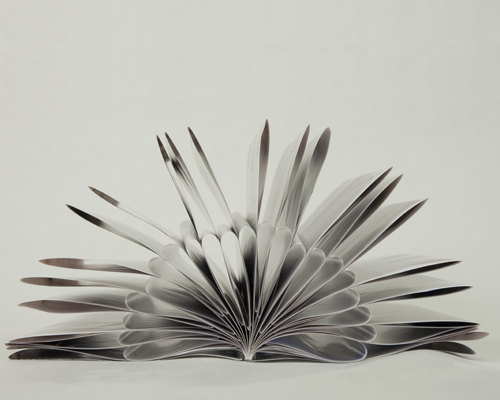 För fyra år sedan, inför ett mönsterprojekt gjorde vi de här vikningarna och fotograferade. Det blev rätt fina bilder med association till blommor tycker jag. Långt senare har jag sett att det är populärt att gör ”bokkonst” på ett liknande sätt, har sett det i reklam och bloggar.