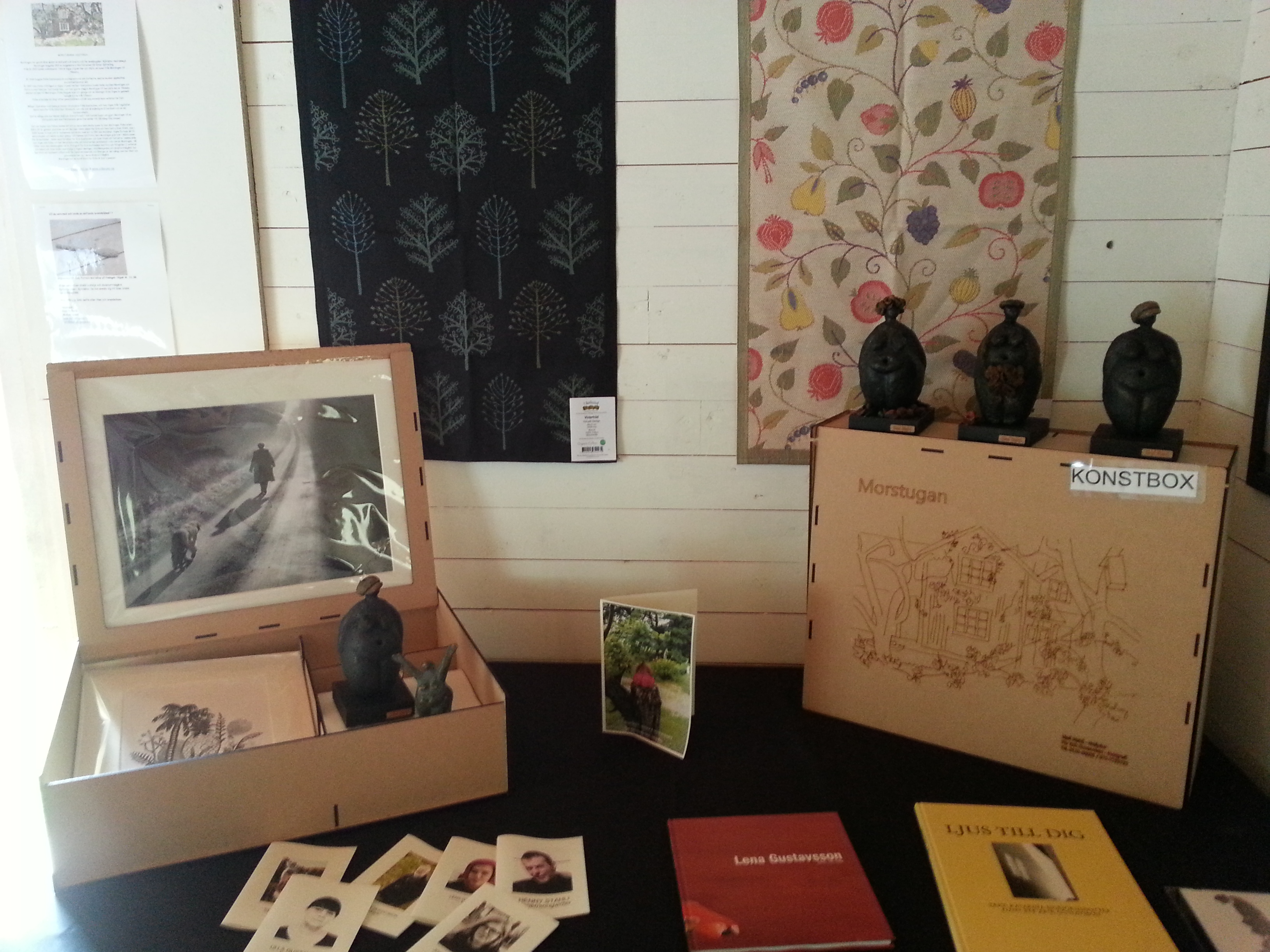 Lite bilder från Konstrundan i Åtvidaberg. Jag var hemma hos min bror Per Erik och min svägerska Sissi Stahli som bor i huset där jag föddes och växte upp. De var med på Konstrundan, Sissi som är skulptör har skapat en jättehärlig och rolig skulpturträdgård. Hon har också kommit med idén om Morstugans Konstbox där jag bl.a. har med ett par handdukar från Ekleunds Linneväveri. Här är några av mina senaste skapelser för Ekelunds. Handdukar och löpare. Nedan några bilder inifrån min brors fotogalleri där Konstboxen visades. Sen lite bilder från trädgården. Tyvärr inga bilder från Sissis galleri, de har faktiskt varsitt. Morstugan heter huset där jag växte upp.