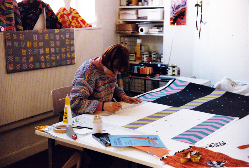 Sen följer lite interiörbilder: först ett av mönstren från vår kollektion ”Janssons Temptation” från 1982 och Birgittas tyg Carmen för Åhléns på fåtöljen. Även detta mönster från 80-talet. Den lilla inramade bilden med löv på rosa botten är en av våra nya skisser.