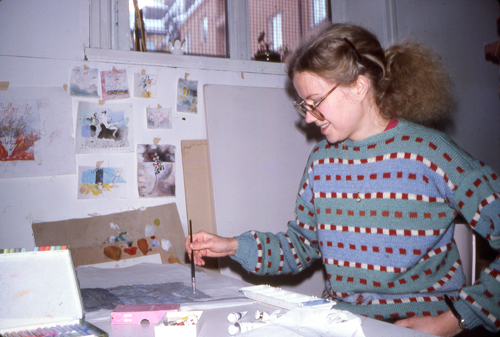 Isa, omgiven av nya mönster och bilder på väggarna.