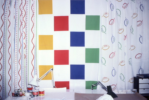 På övre verandan hängde vi upp tygprover från 80-talet. Sådant vi sålt till Åhléns och IKEA samt tryckt själva.