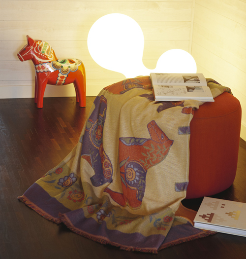 Den här pläden med dalahästar på finns hos Ekelunds Linneväveri just nu. Mysig att svepa in sig i en kylig höstdag. Bomull/bambuviskos är materialet.