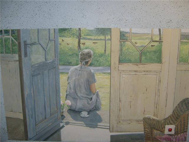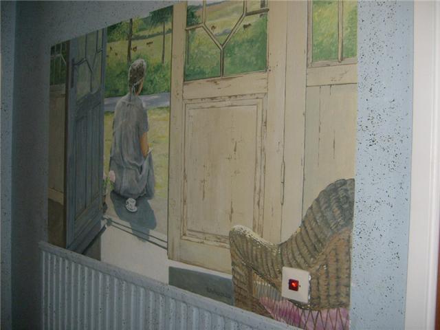 Jag får sommarlängtan när jag tittar på Bitte Hassans härliga väggmålning som hon gjort i ett av sina inredningsprojekt i Ronnebytrakten. Bitte flyttade från Stockholm och vår Kattensamvaro i slutet på 80-talet och började jobba som designer på Tarkett i Ronneby. Nedan en annan vinkel, så ser man att målningen är gjord ovanför ett element. Blicken riktas mot den imaginära utsikten och det ger ett djup.